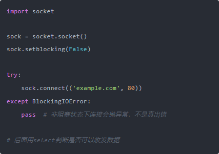 非阻塞就不一樣了,它不會(huì)等你,直接返回,然后你可以自己輪詢或者注冊(cè)回調(diào),再回來(lái)處理數(shù)據(jù)。用Python寫(xiě)個(gè)簡(jiǎn)單的非阻塞版本是這樣的: