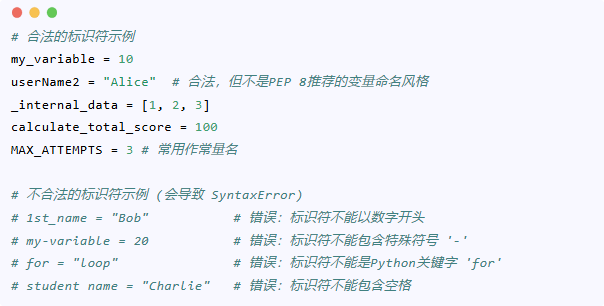 標識符(Identifiers)是你作為程序員在Python程序中自定義的名稱。它們用于命名程序中的各種“實體”,包括變量、函數、類、模塊,甚至是文件。你可以將標識符理解為為這些代碼元素貼上的“標簽”,以便于在程序中識別和引用它們。
