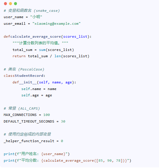 - ? 避免使用拼音或漢字:雖然Python支持,但為了代碼的國際化、通用性和專業性,強烈建議使用英文或廣為人知的縮寫。