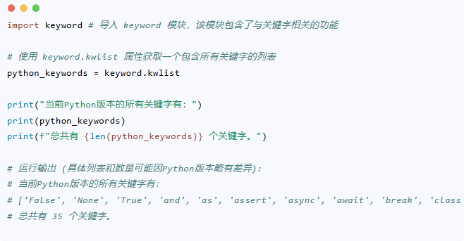 - ? 數量有限且固定:Python的關鍵字數量是固定且相對較少的,這有助于保持語言的簡潔性。隨著Python版本的更新,偶爾會有新的關鍵字加入。