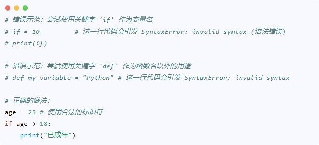 當你運行嘗試使用關鍵字作為標識符的代碼時,Python解釋器會立刻報告 SyntaxError,因為它無法理解這種用法。