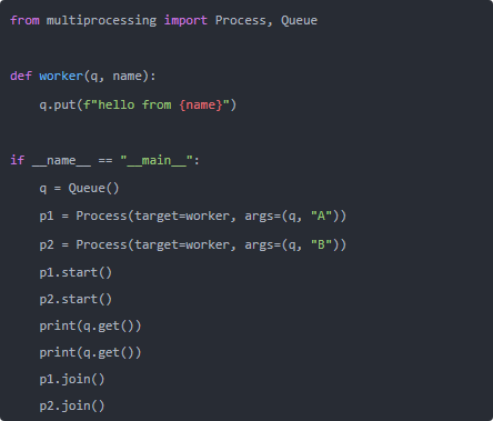 這個就像是進程 A 和 B 都往群里丟了一條消息,主進程作為“群主”把它們收下來了。缺點是消息要序列化、反序列化(pickle),速度比直接共享內存慢點。