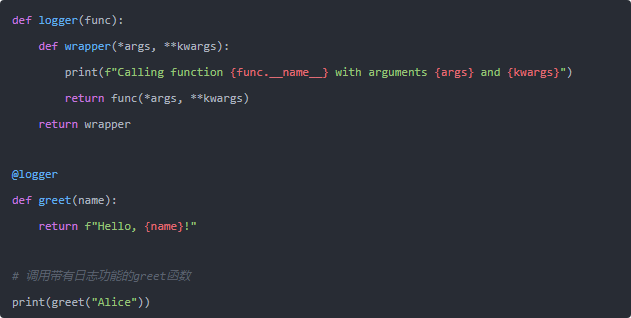 在這個例子中,我們沒有修改greet函數的代碼,而是通過裝飾器logger來為它添加日志功能。這種方法非常適合在不改變原有代碼的情況下給函數添加額外的功能。