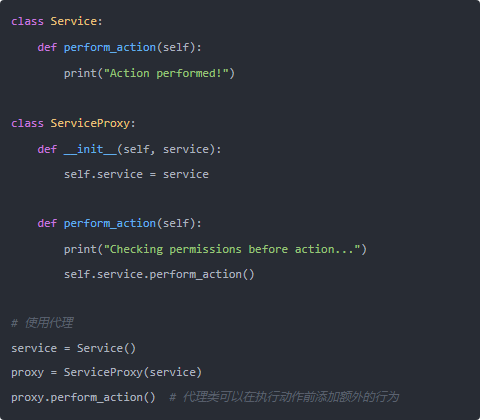 代理模式是一種結構模式,它提供了一個替代品(代理類)來控制對原始類的訪問。代理類通常用于控制某些操作的執行(例如權限控制、延遲加載等)。通過代理模式,我們可以在不修改原始類的情況下,改變類的行為。