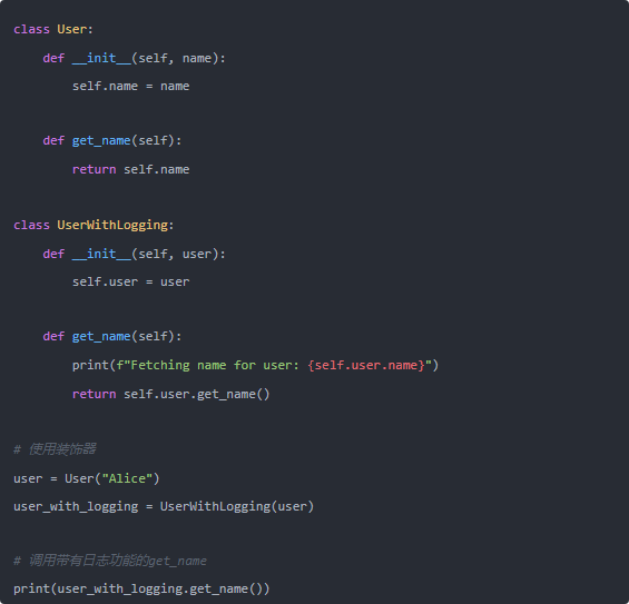 在這個例子中,UserWithLogging并沒有修改User類的源代碼,而是通過包裝User對象來添加日志功能。這樣,我們實現了在不改變User類的情況下,擴展了它的功能。