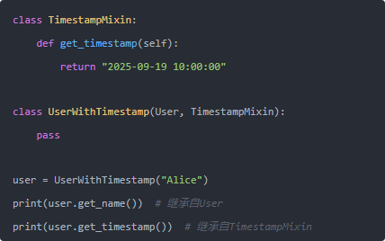 在這個例子中,UserWithTimestamp類通過繼承TimestampMixin來獲取get_timestamp方法,而沒有修改User類的代碼。