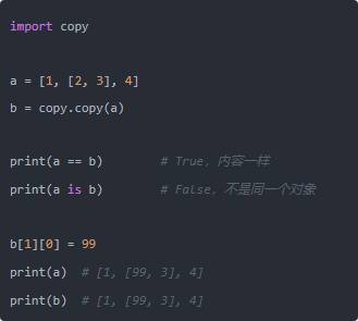 你看,最外層的列表確實是新建了一份,但里面的 [2, 3] 還是公用的,所以改了 b 里面的值,a 也跟著變了。