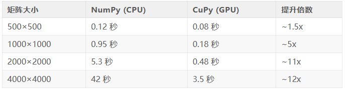 能看到一個規律:矩陣越大,GPU 越能發揮優勢;小規模時,CPU 反而沒差多少,甚至有時候更快(因為 GPU 數據拷貝有開銷)。