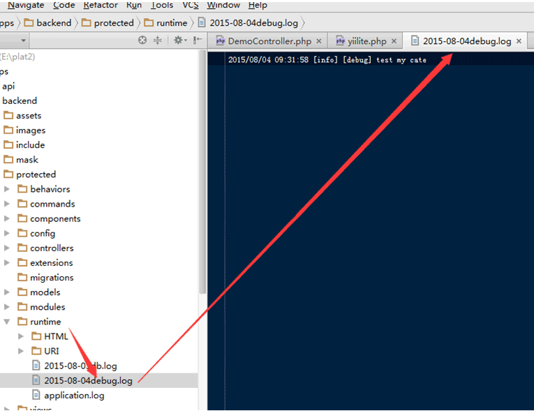 Yii::log("test my cate" , CLogger::LEVEL_INFO , "debug");