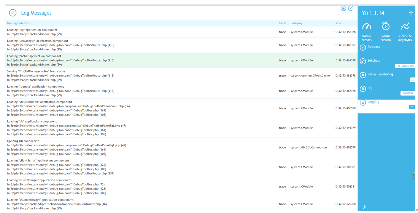 'log'=>array( 'class'=>'CLogRouter', 'routes'=>array( array( 'class' => 'CProfileLogRoute', 'levels'=>'profile,info,trace,warning,error', ),