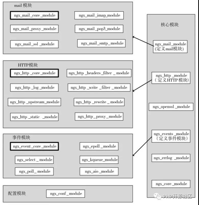 所有模塊間是分層次、分類別的,Nginx 官方共有五大類型的模塊:核心模塊、配置模塊、事件模塊、HTTP 模塊、mail 模塊。它們之間的關系如下: